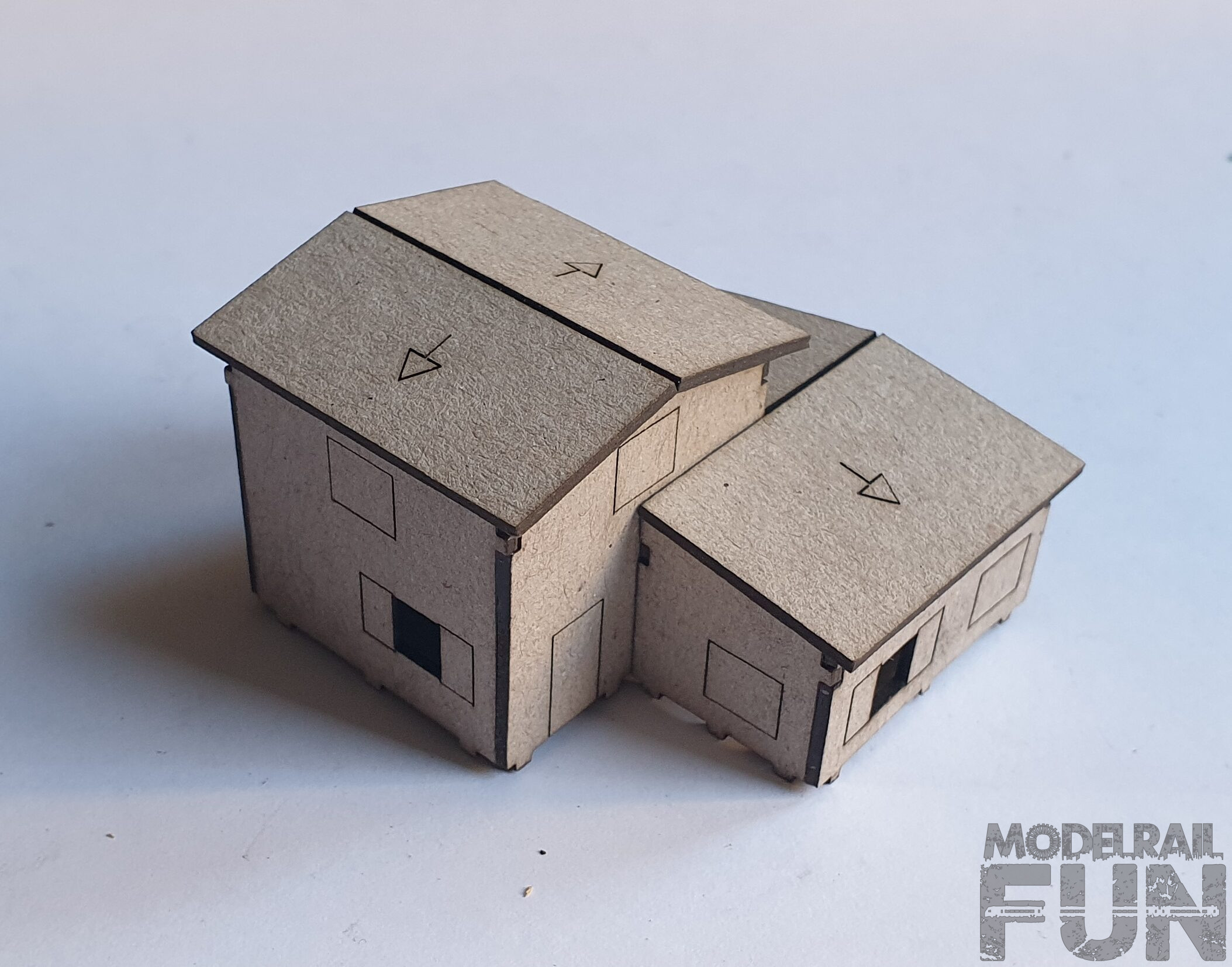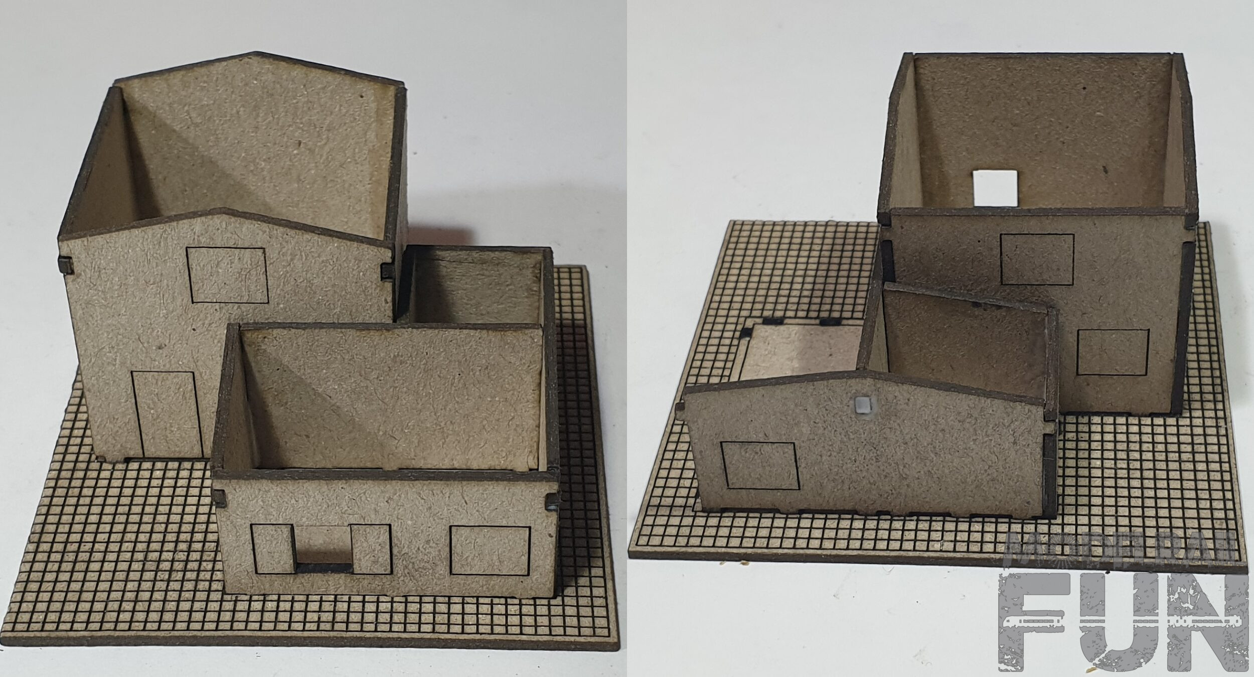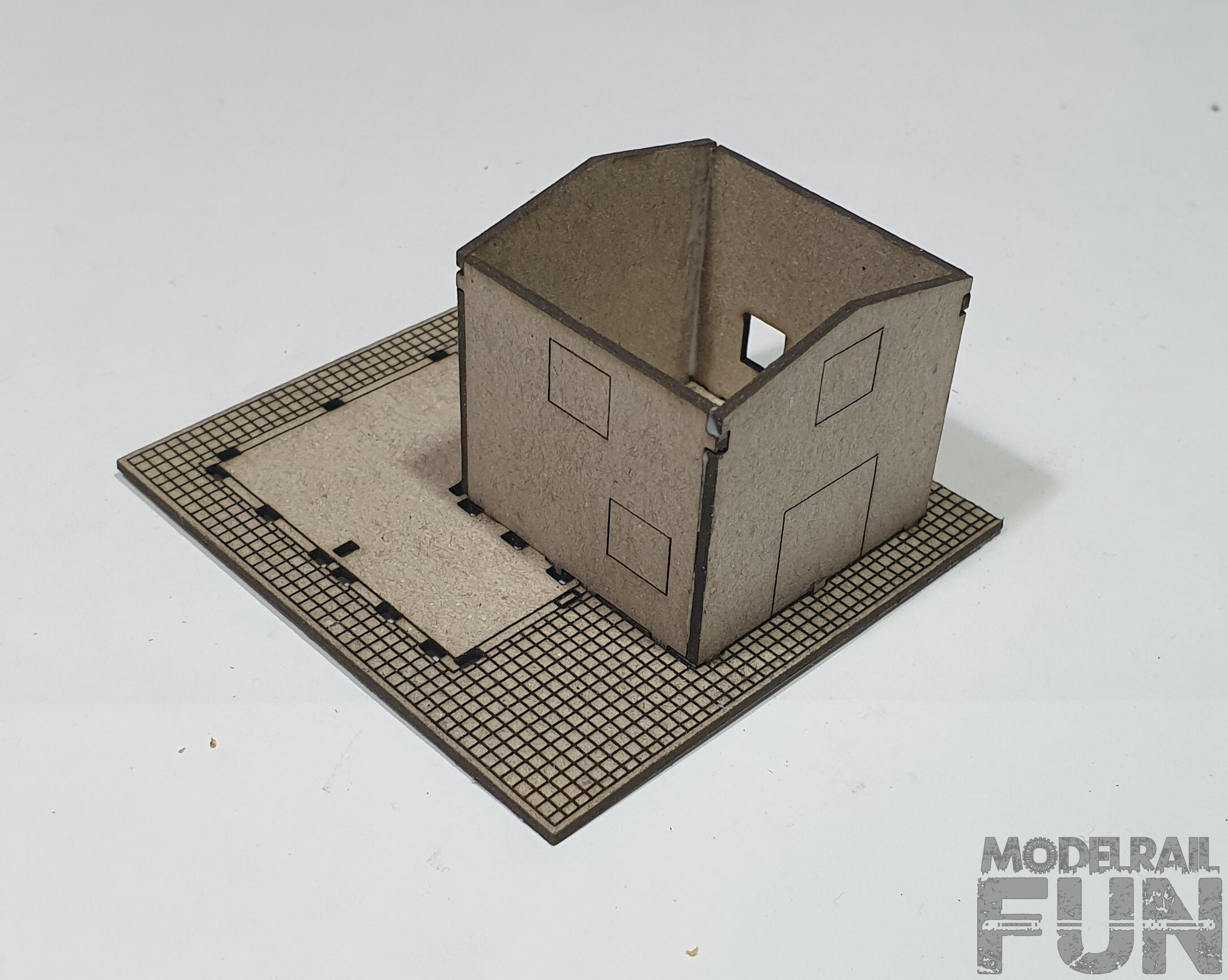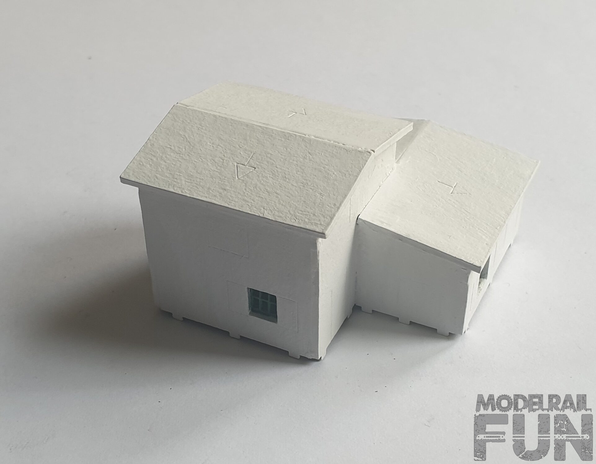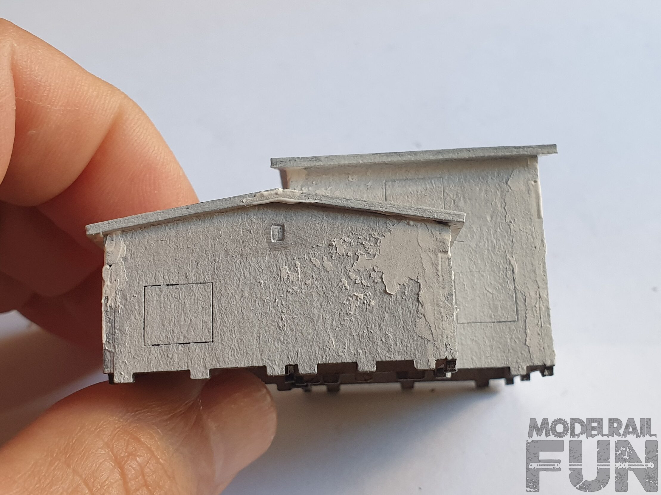El edificio ha recibido una segunda mano de imprimación y dos manos de pintura blanca acrílica de Vallejo. Aprovechando que no tiene el suelo, se colocan las ventanas.