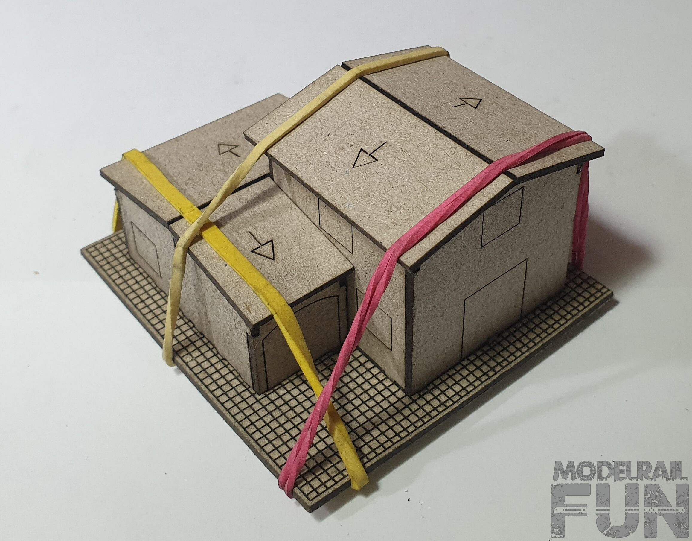 El siguiente paso ha sido encolar el techo, ambas piezas tienen grabadas unas flechas que indican el sentido del doblaje, para darle forma al tejado, una vez fijados, lo sujetamos con gomas elásticas hasta su secado.